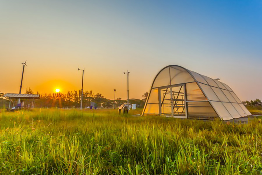 การสร้างห้องอบแห้งพลังงานแสงอาทิตย์แบบเรือนกระจก โดยการอาศัยหลักการของเรือนกระจก กล่าวคือ เมื่อรังสีดวงอาทิตย์ส่องผ่านกระจกหรือพลาสติกใสเข้าไปภายใน จะถูกพืชและองค์ประกอบต่าง ๆ ภายในเรือนกระจกดูดกลืน แล้วเปลี่ยนเป็นความร้อน วัสดุภายในโรงเรือนจะแผ่รังสีอินฟราเรดออกมา แต่ไม่สามารถผ่านกระจกออกมาภายนอกได้ ทำให้อากาศในเรือนกระจกร้อนขึ้นและถ่ายเทความร้อนให้กับผลิตภัณฑ์ ห้องอบแห้งแบบเรือนกระจกที่พัฒนาขึ้นนี้ จะใช้แผ่นโพลีคาร์บอเนตแทนกระจก เนื่องจากสามารถดัดโค้งได้ง่าย น้ำหนักเบา และแสงอาทิตย์ผ่านได้ดี มีพัดลมระบายอากาศซึ่งทำงานด้วยไฟฟ้าจากพลังงานแสงอาทิตย์ (Solar cell) เครื่องช่วยให้อากาศไหลเวียนในทิศทางที่ต้องการ คือ จะมีพัดลมติดตั้งในระบบเพื่อบังคับให้มีการไหลของอากาศผ่านระบบ อากาศร้อนที่ไหลผ่านพัดลมและห้องอบแห้งจะมีความชื้นสัมพัทธ์ต่ำกว่าความชื้น ของพืชผล จึงพาความชื้นจากพืชผลออกสู่ภายนอกทำให้พืชผลที่อบไว้แห้งได้ เหมาะสมกับการอบแห้งเครื่องเทศ เช่น พริก และใบมะกรูด แต่ก็สามารถอบแห้งผลิตภัณฑ์อื่นได้ด้วย เช่น กล้วยและอาหารทะเล เป็นต้น เครื่องอบแห้งนี้สามารถอบแห้งผลิตภัณฑ์สดได้ครั้งละ 250 – 300 กิโลกรัม โดยอุณหภูมิของอากาศภายในเครื่องอบแห้งอยู่ในช่วง 40 – 70 องศาเซลเซียส ระหว่างเวลา 9.00 น. – 17.00 น. การอบแห้งแต่ละครั้งจะใช้เวลาในการอบแห้งประมาณ 3 – 4 วัน