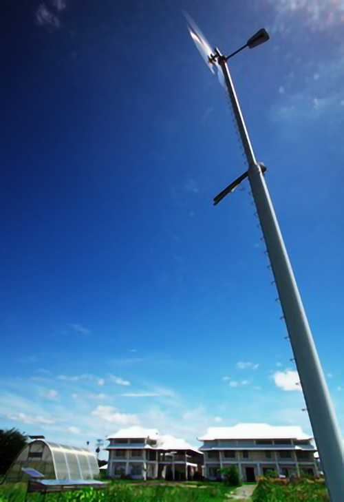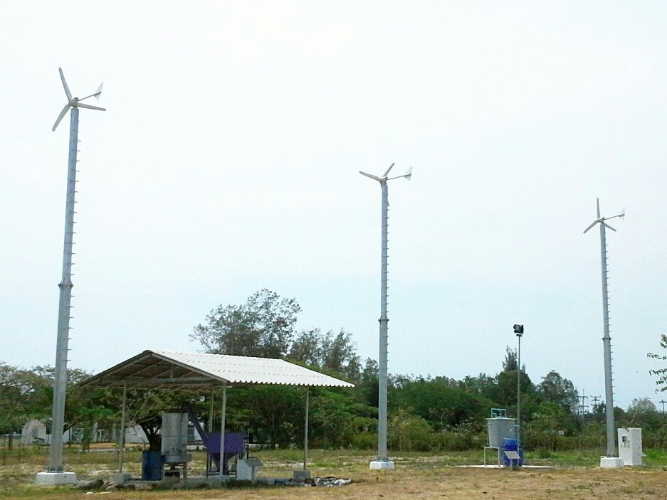 สำหรับ กังหันลมที่ติดตั้งบริเวณศูนย์พลังงานเพื่อสิ่งแวดล้อม เป็นกังหันลมเพื่อการผลิตกระแสไฟฟ้า ได้ทำการติดตั้งกังหันลมขนาด 400 วัตต์ จำนวน 1 ชุด โดยผลิตกระแสไฟฟ้าประจุในแบตเตอรี่จำนวน 1 ลูก สำหรับใช้เป็นไฟแสงสว่างในช่วงเวลากลางคืน และกังหันลมขนาด 1 กิโลวัตต์ จำนวน 3 ชุด